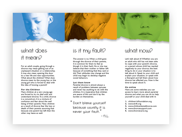 For this campaign, I created a small typographic logo showcasing the title “Let’s Talk Divorce”. This logo is displayed on three posters that I created to advertise the campaign as well as a brochure designed to provide information on the issue of parental divorce and actions that can be taken to help children cope. The images of the children seen on the posters and on the brochure are stock photos that I purchased online and altered for use in this project.