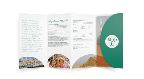 As an intern for SPARK Experience Design, I had the wonderful privilege of working with their client Mejdi Tours. I was given the job of designing a brochure containing information pertaining to the different services and experiences that Mejdi promises its customers. I designed the entire layout of the brochure along with some 20 handouts that were to be distributed based on the personal needs of their clientele. Mejdi Tours provided the content for the brochure, including the logo.