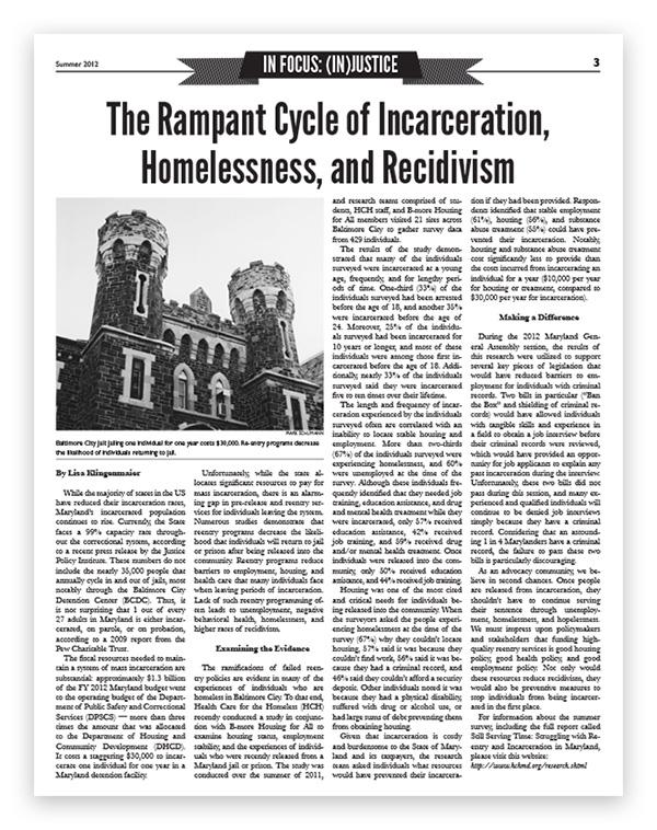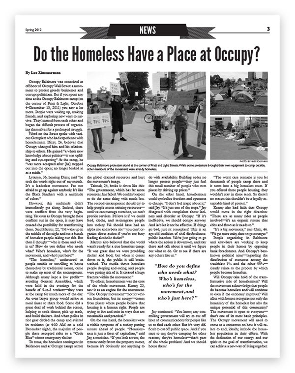 I was lucky enough to take part in this collaboration. For the first two issues of the paper, I worked on the first page. Following a pre-established and very detailed style guide, I was able to create a layout that effectively fit each story on one page without compromising the content. I also worked on a poster to advertise the newspaper. The poster included an illustration that I created, accompanied by a brief yet comprehensive emotional statement conveying the purpose of the street newspaper. All in all, this project turned out to be one of the most amazing learning experiences that I was able to have at Towson University.